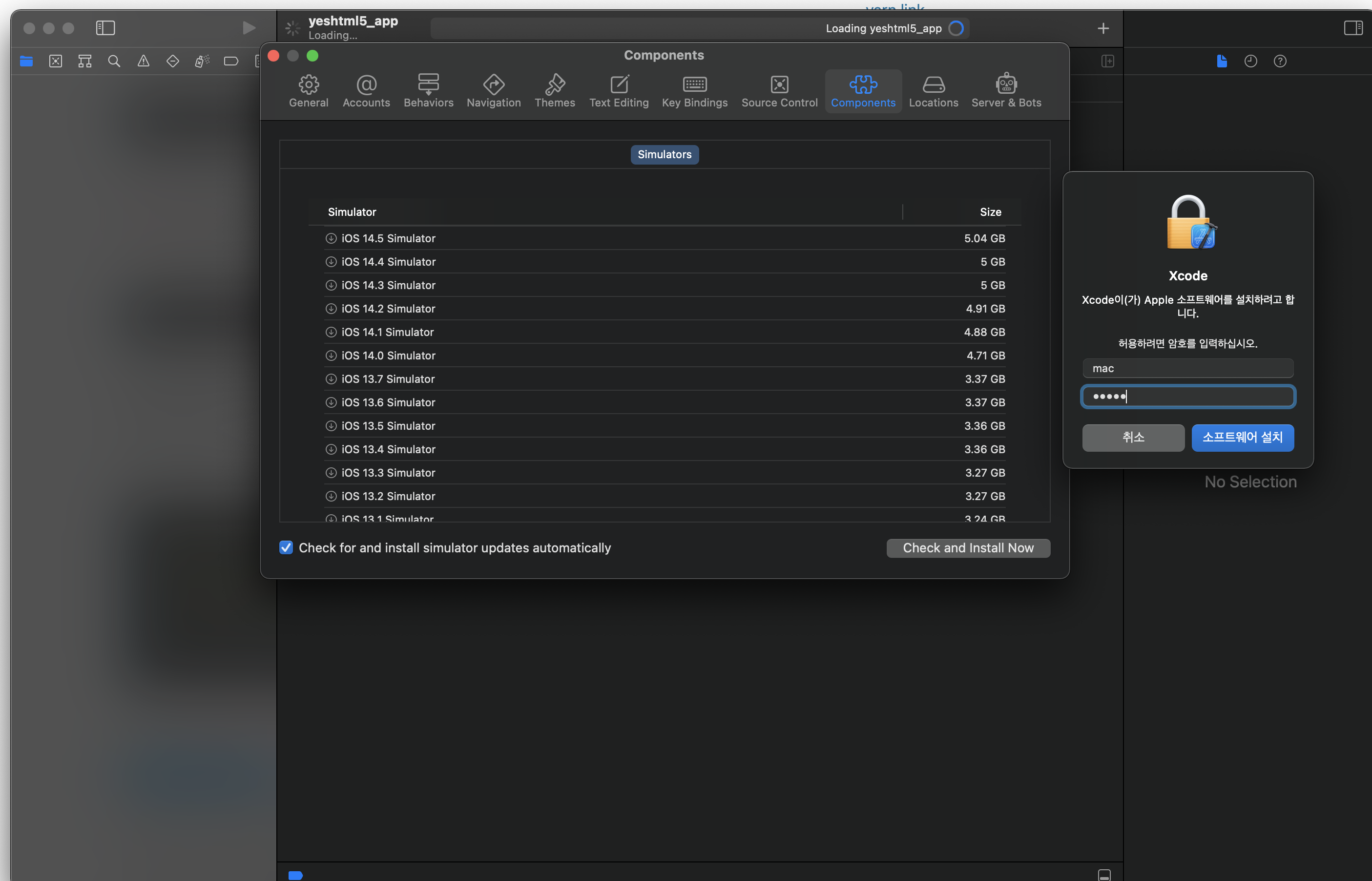 xcode 실행이후 설정 추가 적당한 simulator 선택 설치