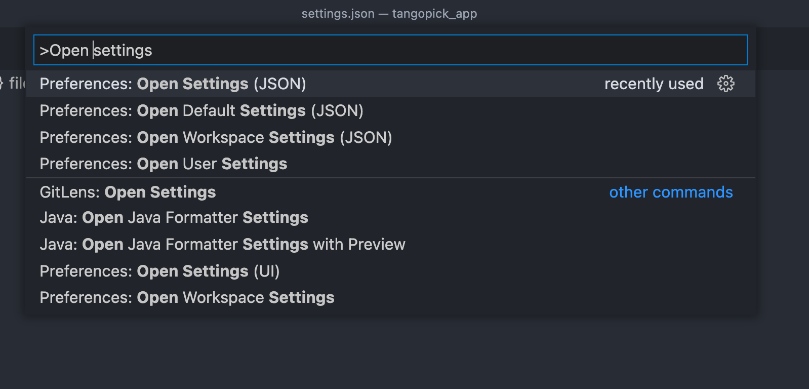 mac기준 CMD+SHIFT + P 로해서 "Open Settings" 를 검색해서 메뉴로 들어간다